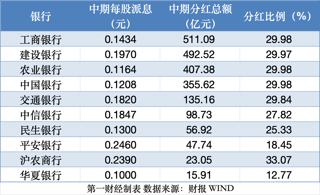 具体来看,工商银行、建设银行、农业银行、中国银行、交通银行中期分红金额分别约为511亿元、493亿元、407亿元、356亿元、135亿元。
