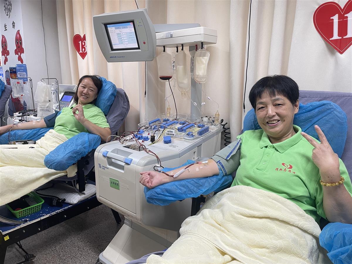 武汉市无偿献血志愿者协会志愿者程迎春和张倩一起坐上了采血椅(通讯员肖莉娇摄)