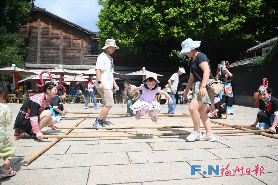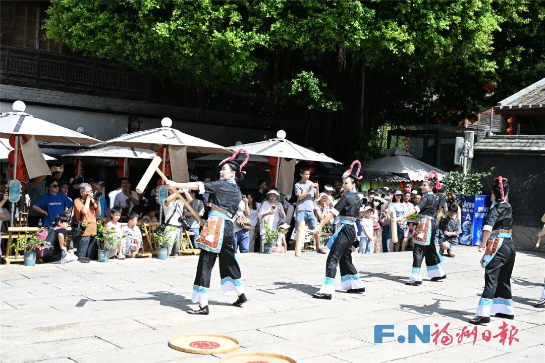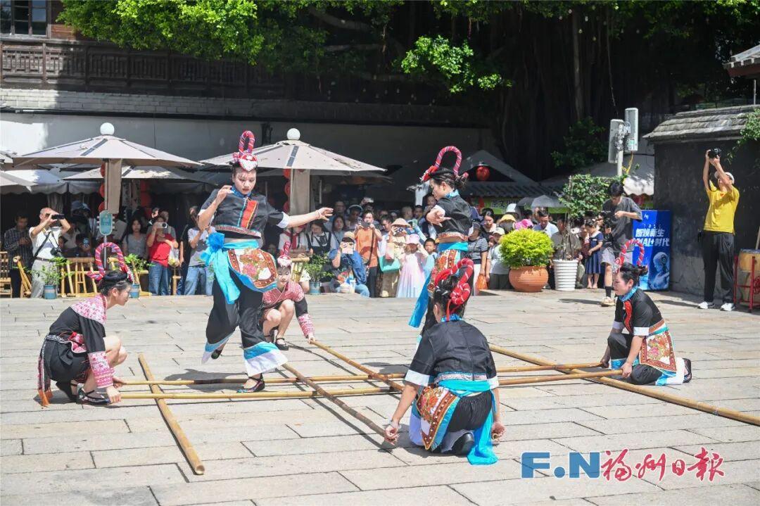 2日上午,在三坊七巷光禄吟台“非遗国潮进古厝”沉浸式街头文艺快闪活动畲族专场吸引了众多游客驻足,并参与互动。