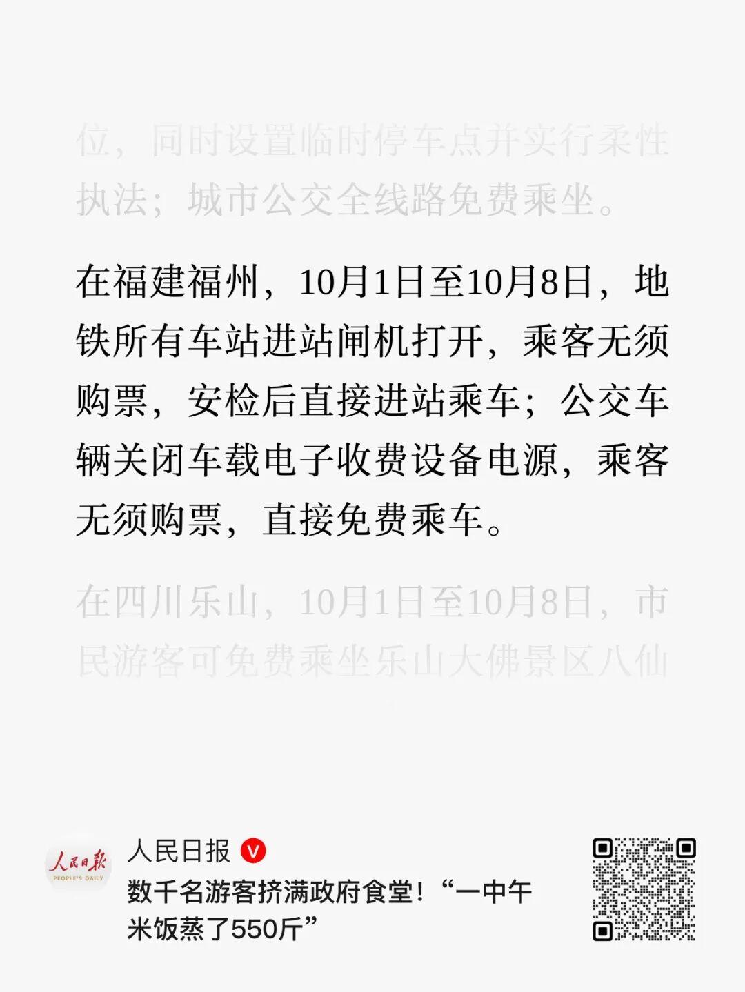 10月2日,人民日报微信公众号关注福州免费公交地铁有关举措——10月1日至10月8日,福州地铁所有车站进站闸机打开,乘客无须购票,安检后直接进站乘车;公交车辆关闭车载电子收费设备电源,乘客无须购票,直接免费乘车。
