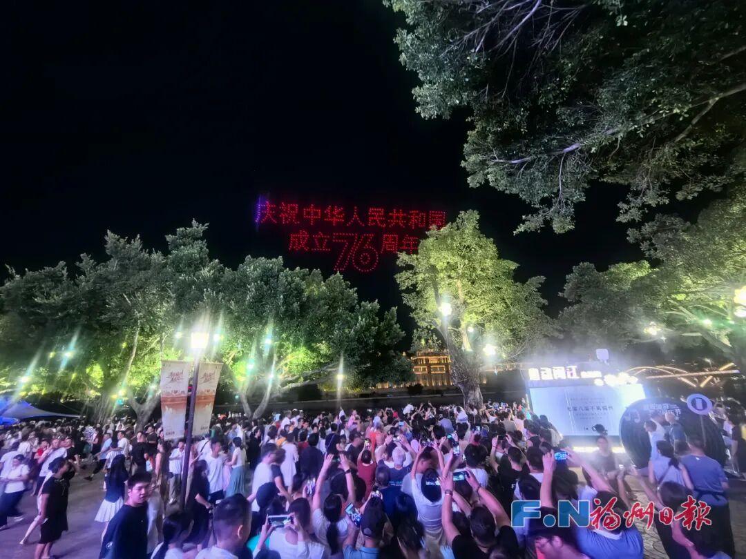 10月1日晚,福州中洲岛上空无人机编队在空中变幻出“遇见福州遇见你”“福满金秋”等精彩画面,为观众呈现科技与艺术交融的视觉盛宴。