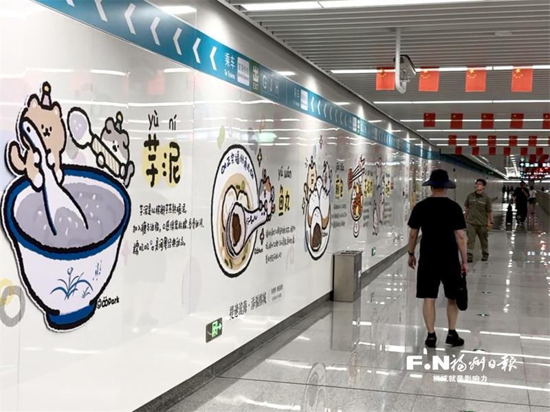 在滨海快线福州火车站站通往地铁1号线的换乘通道内,一面“福州美食”主题插画墙格外吸睛。墙面上,肉燕、鱼丸、佛跳墙等特色美食以萌趣画风跃然墙上,旁侧还附带简短的口味描述与制作工艺科普,吸引不少乘客驻足打卡拍照。