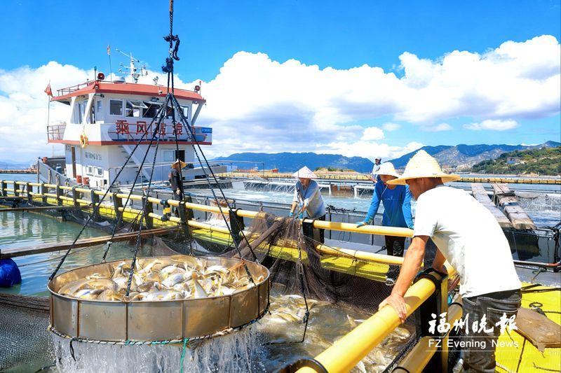 近日,筱埕镇定海湾海域的深水养殖网箱上一派繁忙景象,渔民将成群的大黄鱼聚集到一起,起吊船上的机械臂则缓缓将装满鲜鱼的网筐从海中吊起,金鳞闪闪的大黄鱼在转运筐中活蹦乱跳,经过称重后转移到活水运输船上。