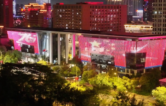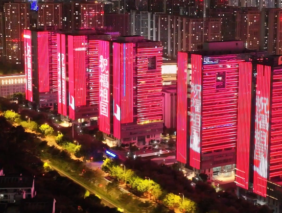 夜幕降临,高新区化身为光影交织的画卷。海西园沿江楼宇群披上“中国红”与“科技蓝”相间的灯光,动态展示“盛世篇章”“喜迎华诞”等国庆标语,与乌龙江面的倒影相映生辉。创新园三期建筑群则通过激光投影与灯光变幻,呈现数字粒子、星河轨迹等科技元素,象征高新区在人工智能、数字经济领域的蓬勃发展。