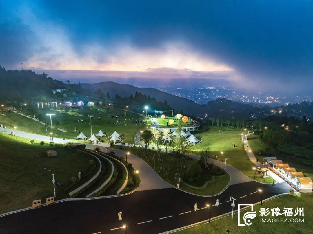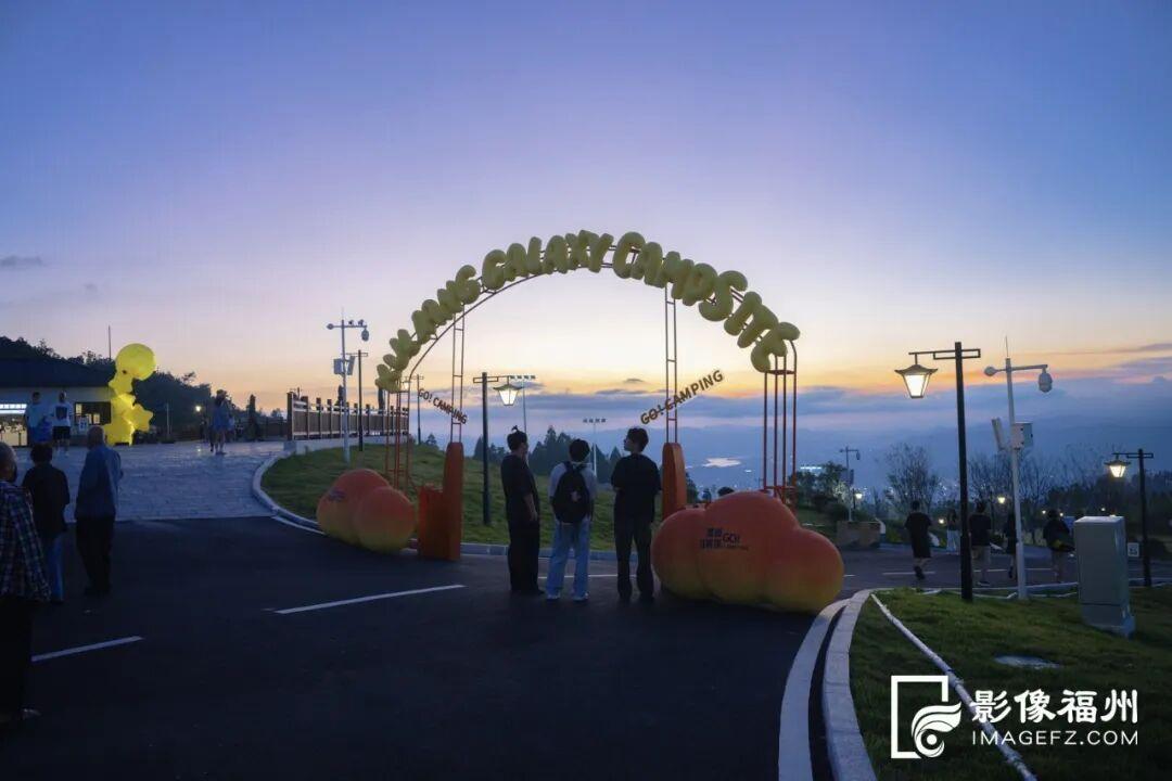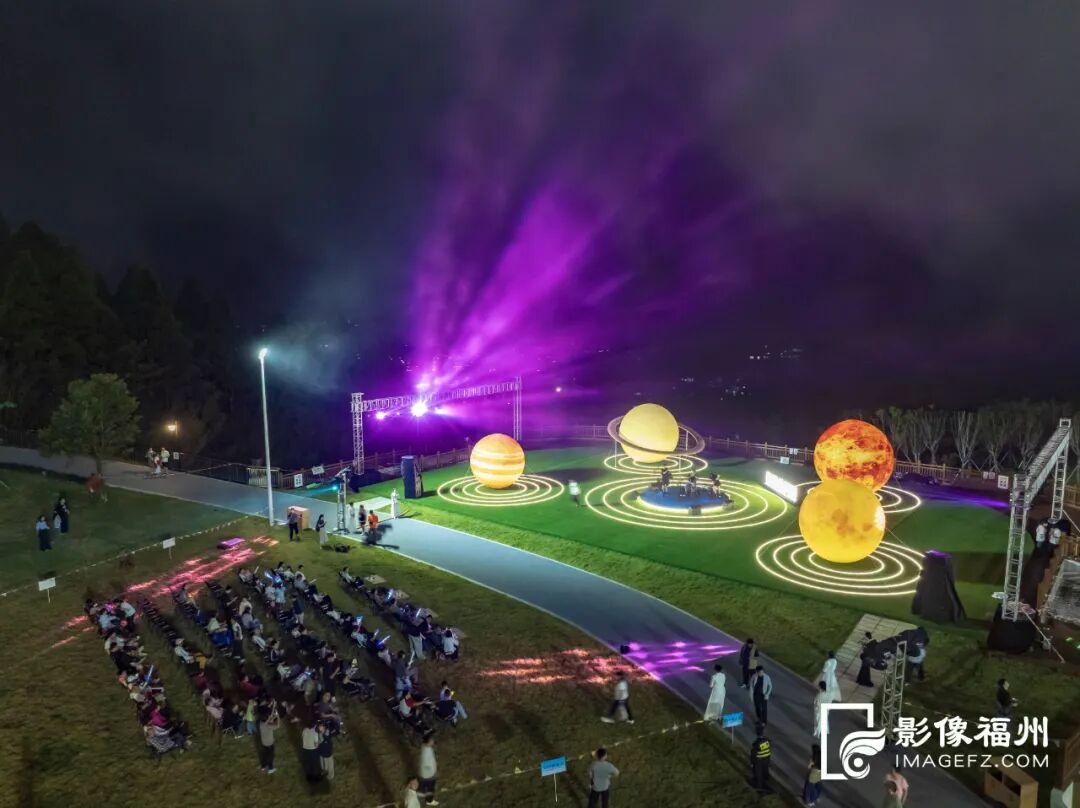 10月3日晚,舞台以“星轨银河”为背景,“鼓岭之友”程高登夫妇、张又新等嘉宾共同按下启动装置,瞬间点亮营区内所有星河美陈装置,银河光影步道顺着阶梯绿野“苏醒”,让人每一步都似踏在星河之上;星辰篝火装置燃起暖光,照亮游客笑脸,与远处城市灯火连成一片,瞬间将“天空之城”的浪漫拉满。