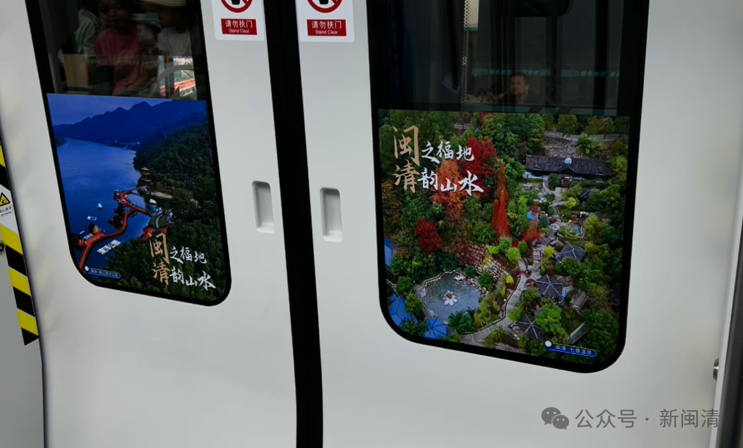 印着“礼乐闽清 欢迎您”的座椅玻璃贴和车楣,搭配融合闽江漂浮公园、黄楮林温泉、白岩山景致等闽清山水,以及义窑青白瓷、闽清·村唱等人文元素的车厢拉手、车厢看板,还有展现闽清美食、闽清民宿、礼乐文化的车门、车窗、大件行李玻璃贴……处处都是闽清元素,让乘客在通勤途中就能“云游”闽清的山山水水、人文风情。