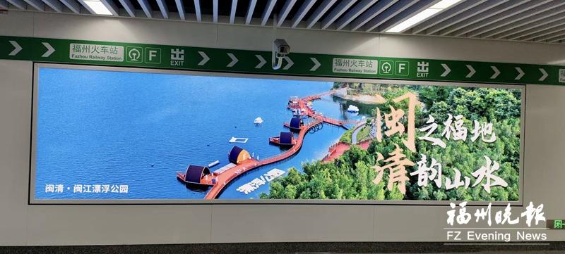 在滨海快线福州火车站站,闽江漂浮公园主题灯箱尤为吸睛。主题广告画面里,水上漂浮栈道蜿蜒于碧波之上,漂浮咖啡馆与船屋错落分布,展现了闽江流域的独特风情。