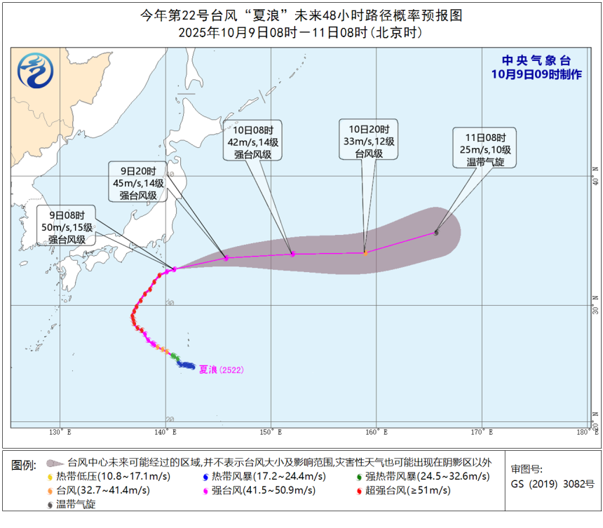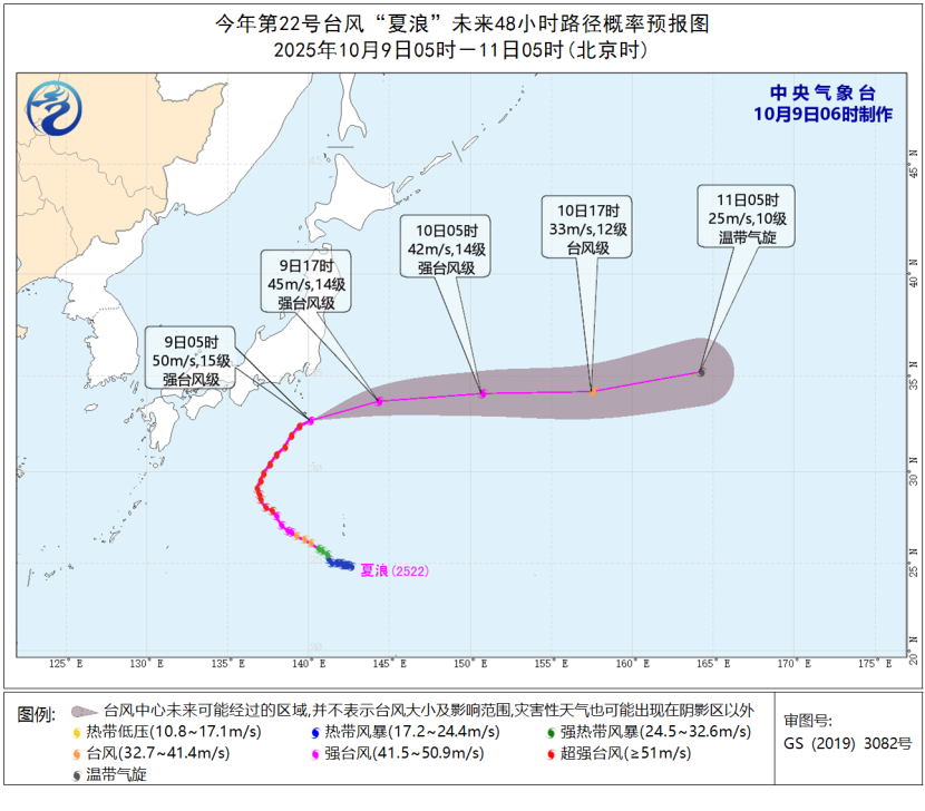与此同时,10月9日早上5时,第22号台风“夏浪”的中心位于日本九州岛偏东方向约850公里的西北太平洋洋面上,中心附近最大风力15级(50米/秒)。
