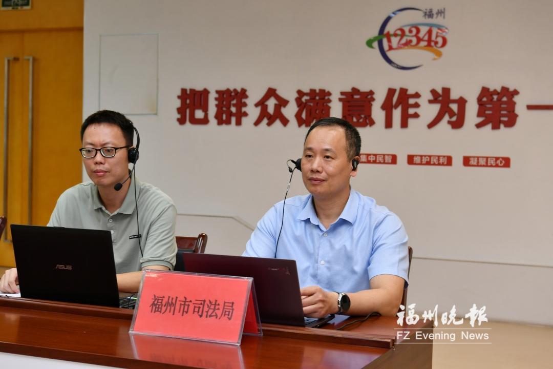 福州市司法局党组书记、局长李雄(右一)接听12345热线。