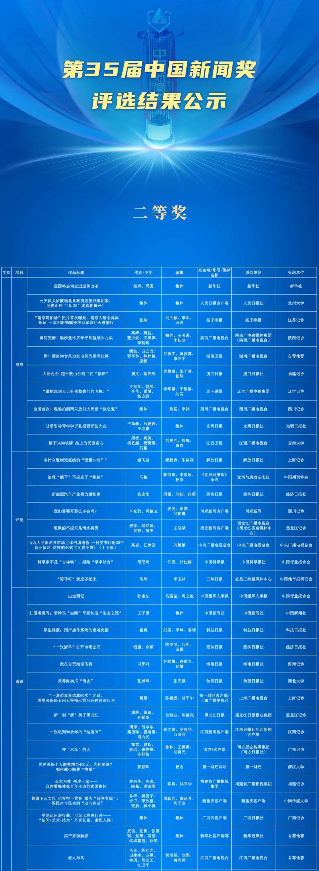 由中华全国新闻工作者协会(简称“中国记协”)主办的第35届中国新闻奖评选结果自今日起在中国记协微信公众号、中国记协网公示。本届拟获奖作品379件,其中特别奖4件、一等奖75件、二等奖113件、三等奖187件。