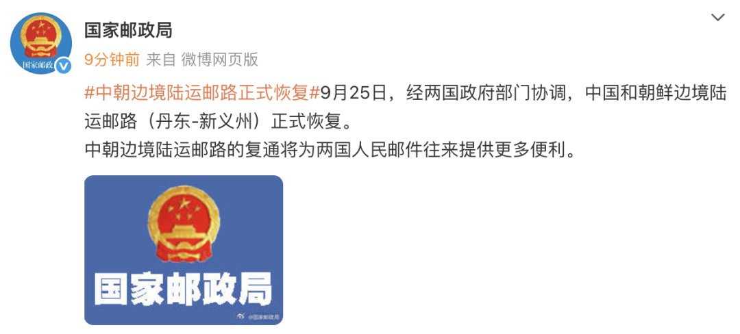 10月10日,据@国家邮政局 消息,9月25日,经两国政府部门协调,中国和朝鲜边境陆运邮路(丹东-新义州)正式恢复。中朝边境陆运邮路的复通将为两国人民邮件往来提供更多便利。