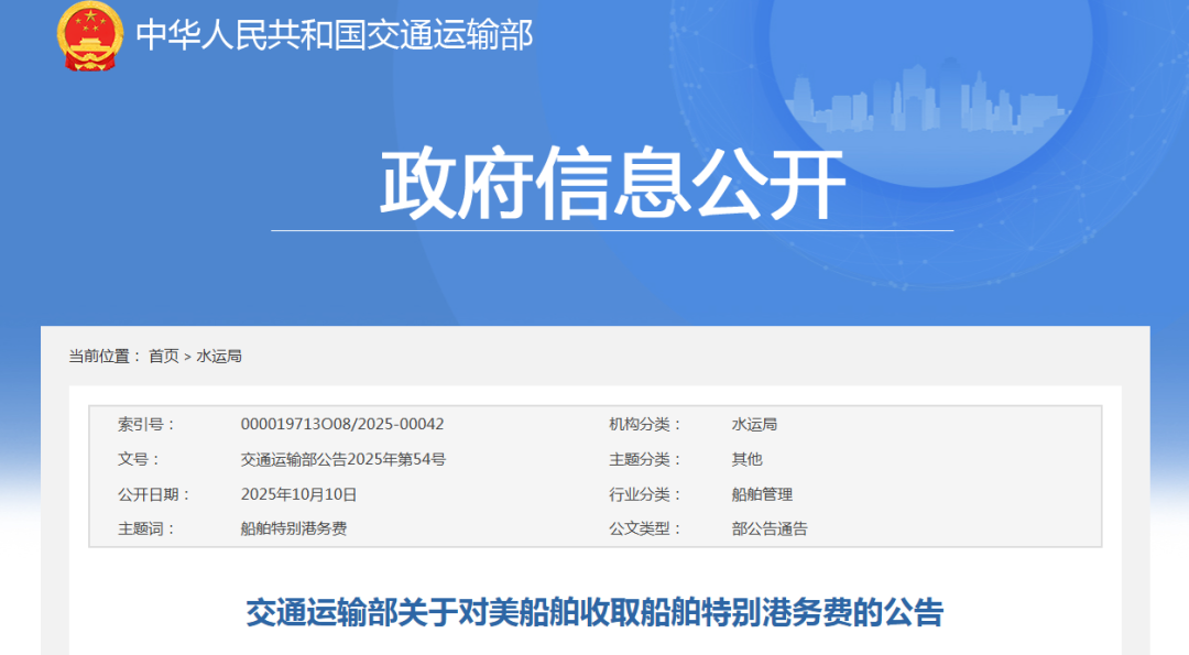 2025年4月17日,美国贸易代表办公室发布关于对中国海事、物流及造船业301调查措施,自2025年10月14日起,将对中国企业拥有或经营的船舶、中国籍船舶及中国造船舶加收港口服务费,严重违背了国际贸易相关原则和中美海运协定,对中美间海运贸易造成严重破坏。