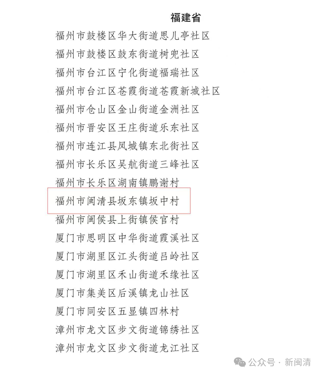 闽清县坂东镇坂中村入选全国示范... 根据全国老龄工作委员会办公室《关于公布2025—2026年全国示范性老年友好型社区创建名单的通知》,...