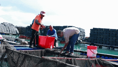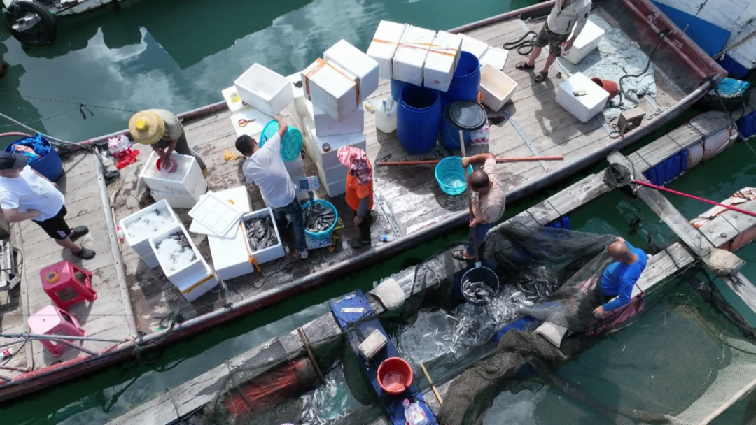 在鉴江镇井水村的绿鳍马面鲀养殖鱼排上,一派丰收忙碌的景象。记者在现场看到,工人们正有条不紊地开展起网捕捞作业,鲜活肥美的绿鳍马面鲀不断从水中跃出,活力十足。捕捞后,工人们迅速对鱼体进行放血去腥处理,随即装箱覆冰保鲜,通过冷链物流直送加工工厂,进入后续生产环节。