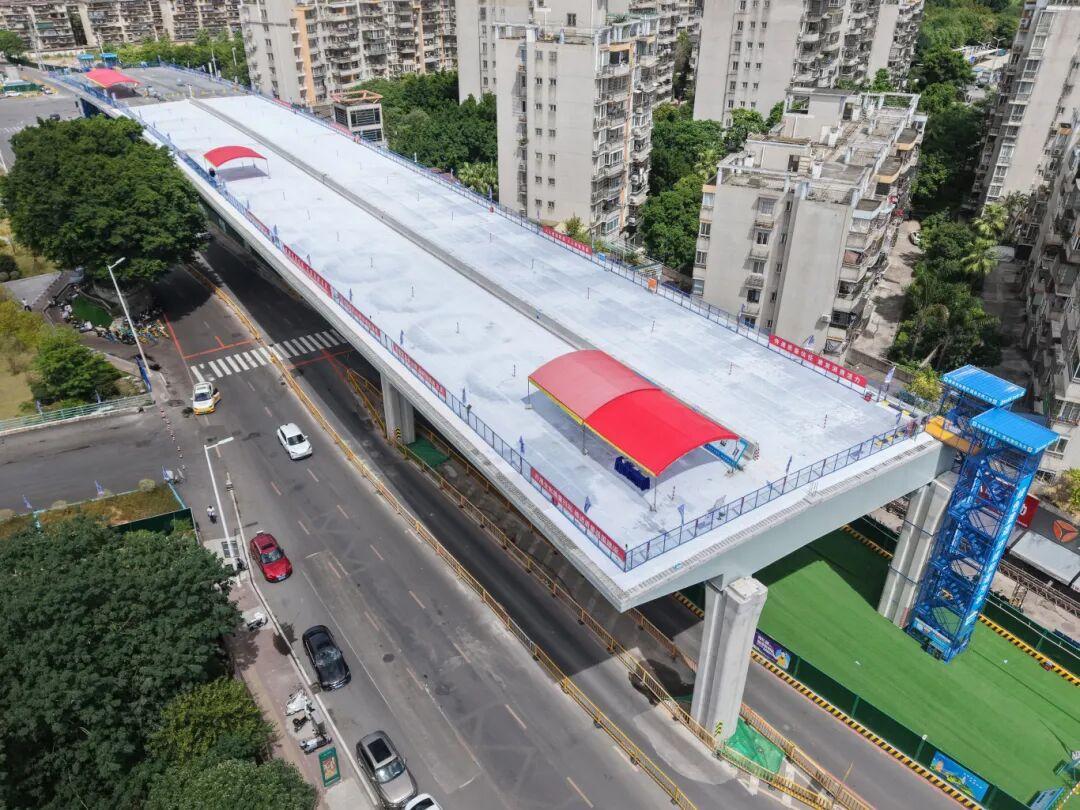 为减少墩柱占地面积,提升整体空间利用率,项目团队创新应用“大悬臂桥型钢混组合梁”结构——在确保施工质量的同时,最大程度减少施工对地铁正常运营及桥下道路通行的干扰,在有限空间中实现交通的高效分流。