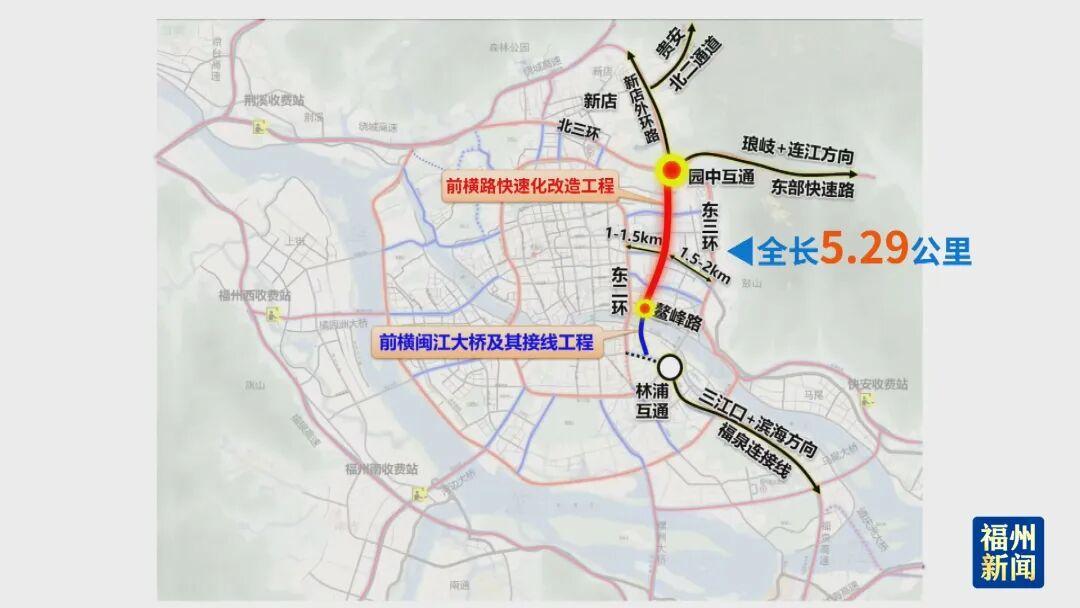 前横路快速化改造工程,南起鳌峰路,与前横闽江大桥及接线工程相接,北至园中互通,总长5285米,宽度40米~70米。