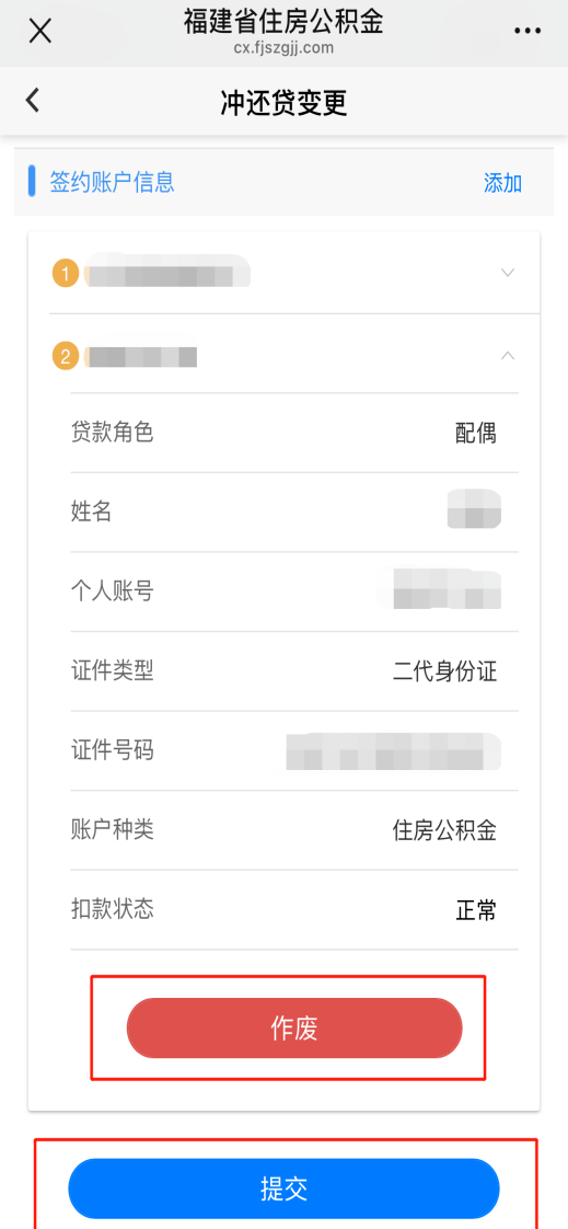 (2)委托还贷变更(主借款人配偶或主借款人可通过“添加”或“作废”公积金或补贴账户完成增员或减员操作)