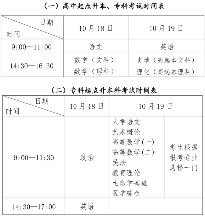 全国成人高等学校招生统一考试日期为10月18日—19日。
