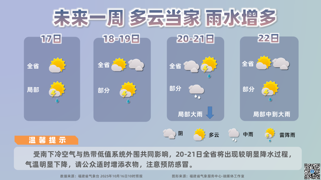 展望下周,天气形势更为复杂。受南下冷空气和热带低值系统外围共同影响,20—21日,全省阴有阵雨或雷阵雨,部分中雨,局部大雨。气温波动伴随降雨,体感温度下降明显,请适时添衣,注意预防感冒。