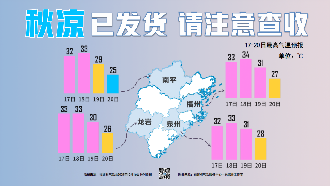 受其影响,下周一,福建大部地区气温迅速转凉,最高气温将降至25℃上下。秋凉到货,衬衫、薄外套注意提早备好。在冷空气到来之前,闷热还是常态,全省大部最高气温在33℃上下,中午前后要注意防暑防晒。