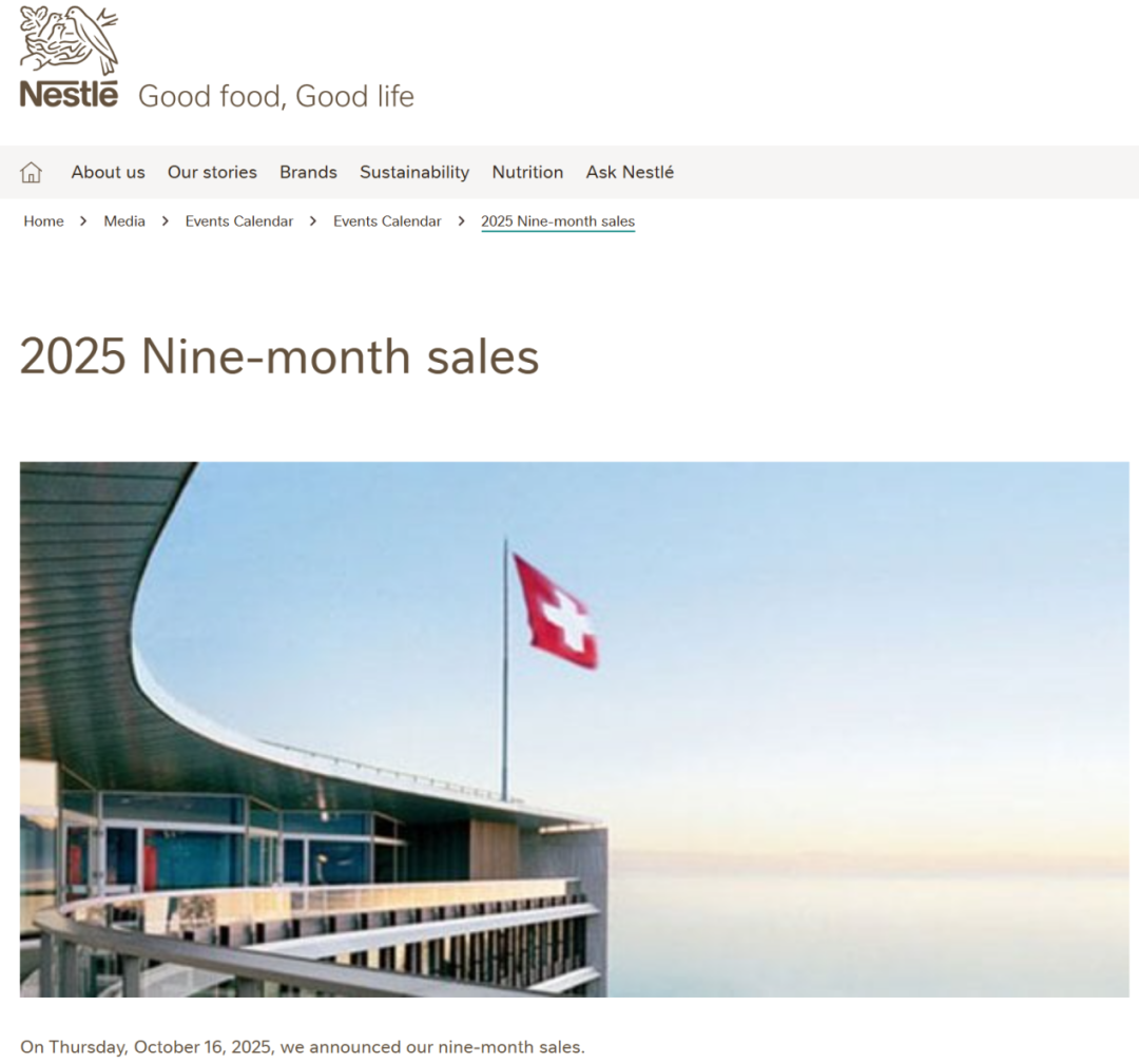 10月16日,雀巢集团发布2025年前9个月财报,当期销售额为658.7亿瑞士法郎,实际内部增长率为0.6%。