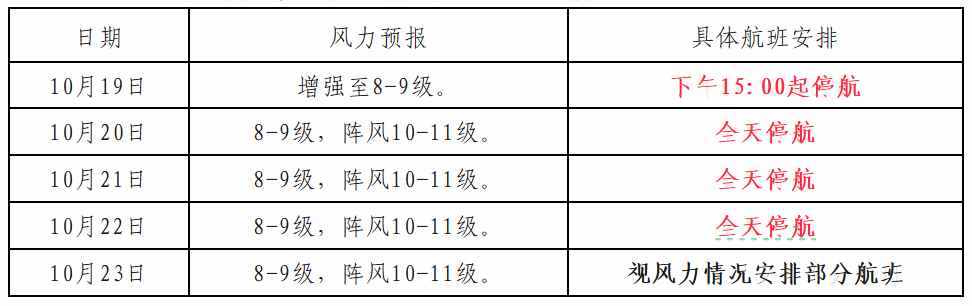 受今年第24号台风“风神”与冷空气共同影响,石南轮渡将于10月19日上午10:30后停航,预计停航持续至10月23日。10月24日航班安排,将视海上风力和涌浪情况另行通知。请各位旅客提前做好准备,实时关注官方公众号及小程序最新动态,合理安排出行。