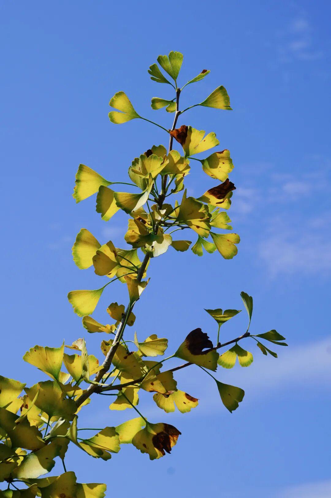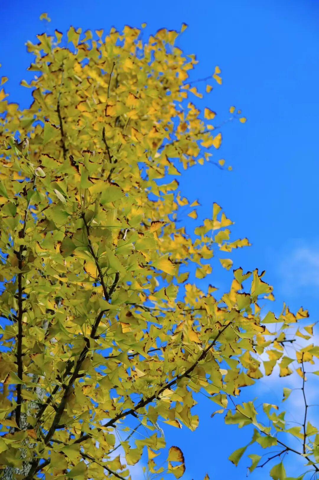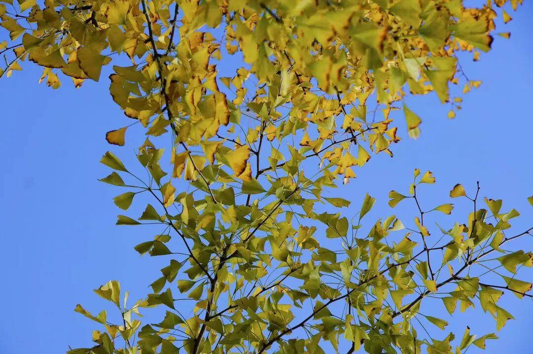 蓝天像是一块澄澈无垠的画布,它慷慨地为银杏撑起广阔的背景,绿黄相间的银杏在蓝天的怀抱中,显得更加挺拔、高贵,它向着天空伸展着枝丫,似乎要把这份秋的美丽分享给蓝天。